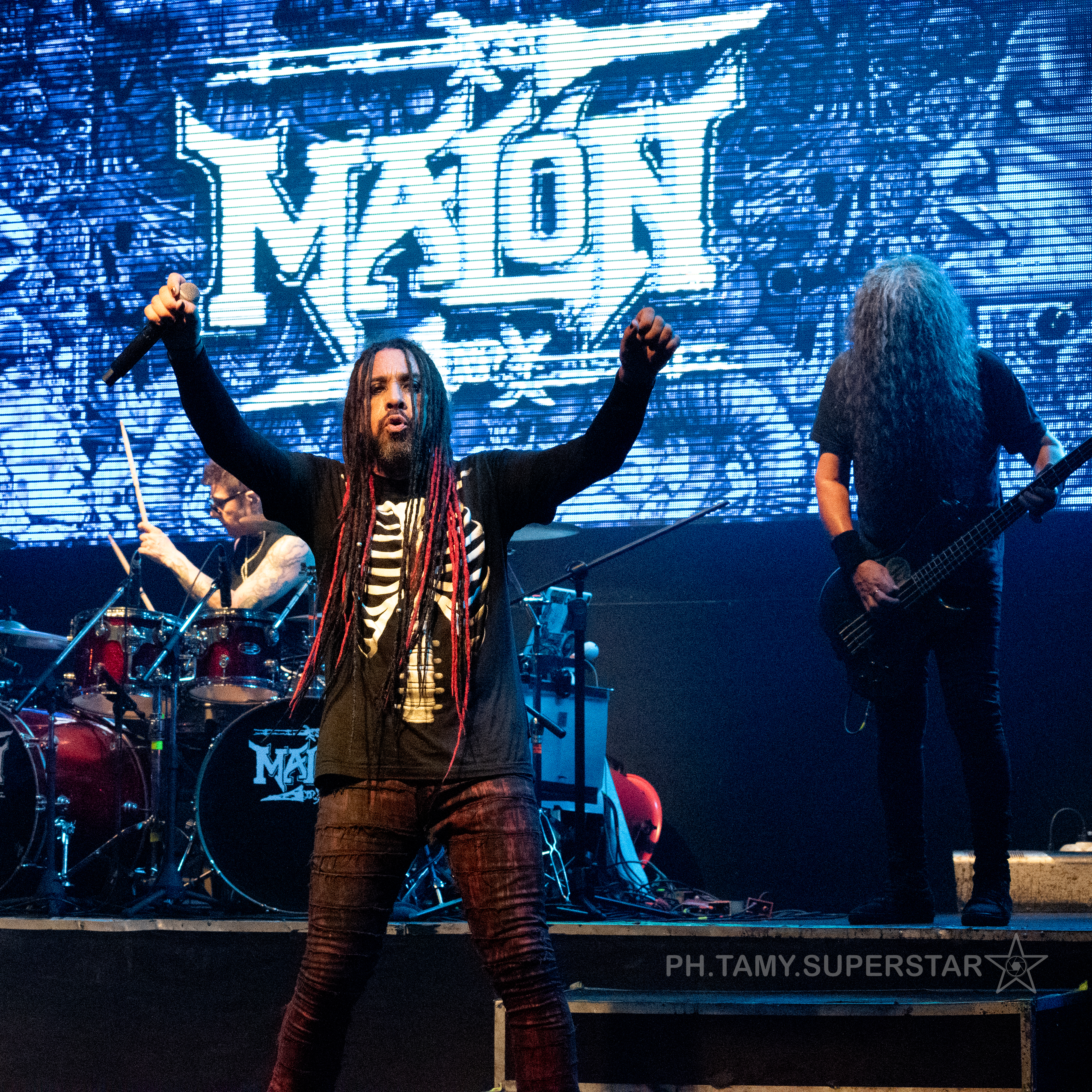 Sin demasiadas vueltas, Malón salió al escenario y lo que siguió fue una hora y media de comunión feroz. Claudio O’Connor, con su presencia intacta y una voz que atraviesa como pocas, se plantó frente a un mar de puños en alto. Junto a él, Antonio Romano desgarró el aire con riffs que parecían cincelados con rabia, Karlos Cuadrado sostuvo el peso de todo con su bajo preciso, y Javier Rubio fue una máquina imparable detrás de los parches.